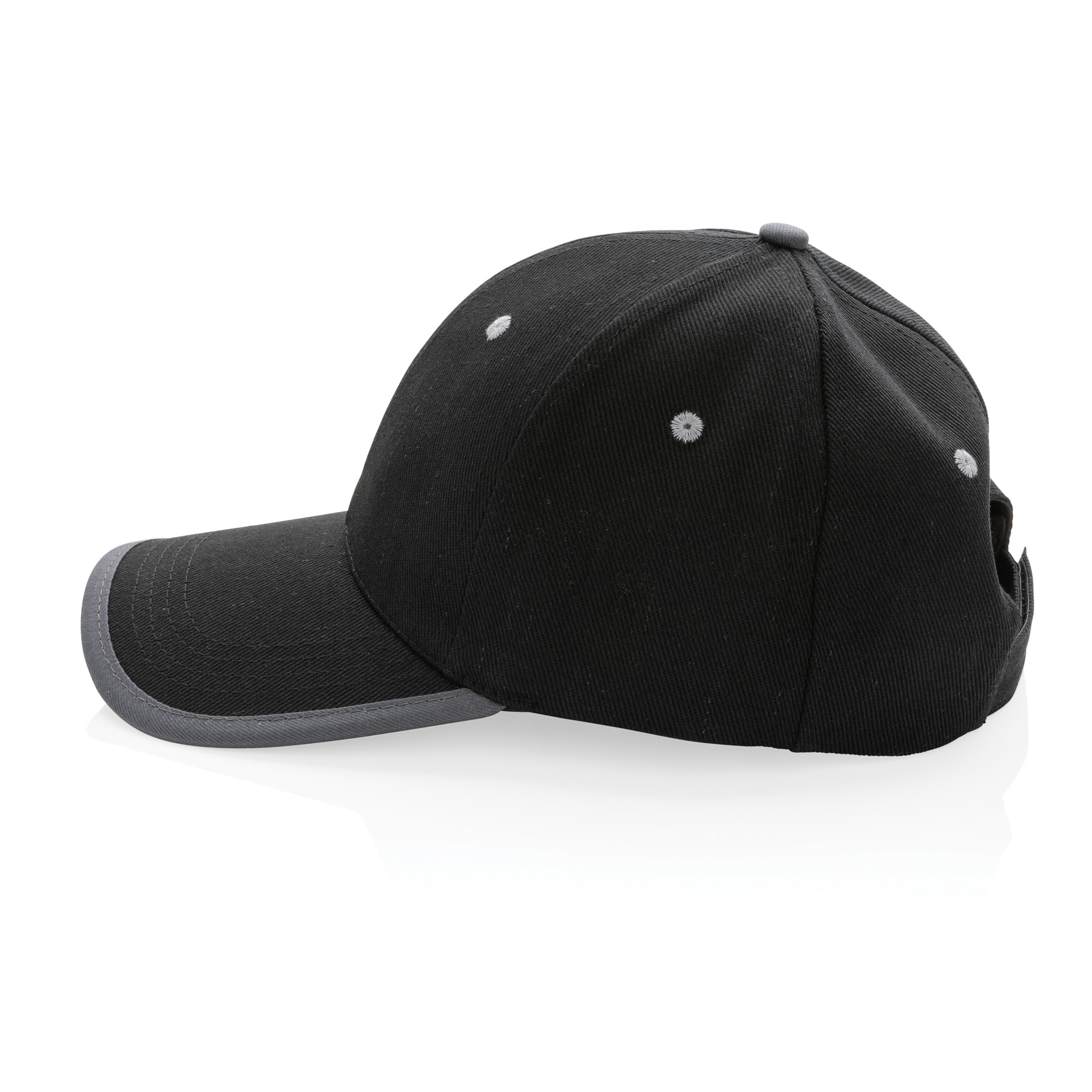 Tell a true story about sustainability and wear it with pride! This 6 panel contrast cap with curved visor is made with brushed recycled 280gr cotton that is embedded with AWARE™ tracer technology. With AWARE™, the use of genuine recycled fabric materials and water reduction impact claims are guaranteed. Save water and use genuine recycled fabrics. If you choose this item you save 250 litres of water. With the focus on water, 2% of proceeds of each Impact product sold will be donated to Water.org. The contrast cap has a dark grey binding and velcro closure. Water savings are based on figures when compared to conventional fibre.