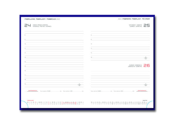 Diary with daily dated interior Dimension: 14.5×20.5 cm White paper, 70gr./m2 336 pages Pattern: 2 colors Bookmark; perforated corner; the map of Romania Languages: Ro, En, It, Fr, De, Es